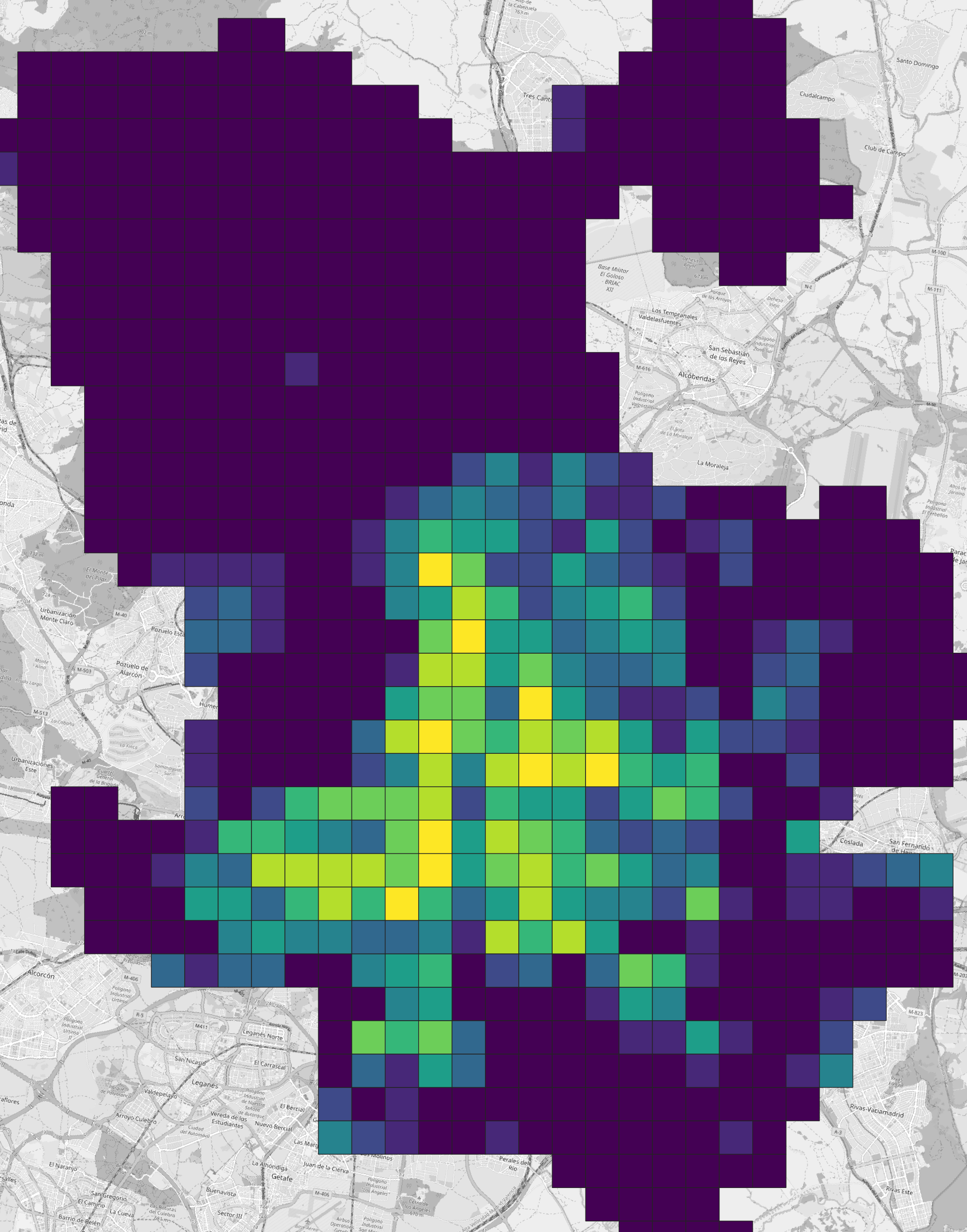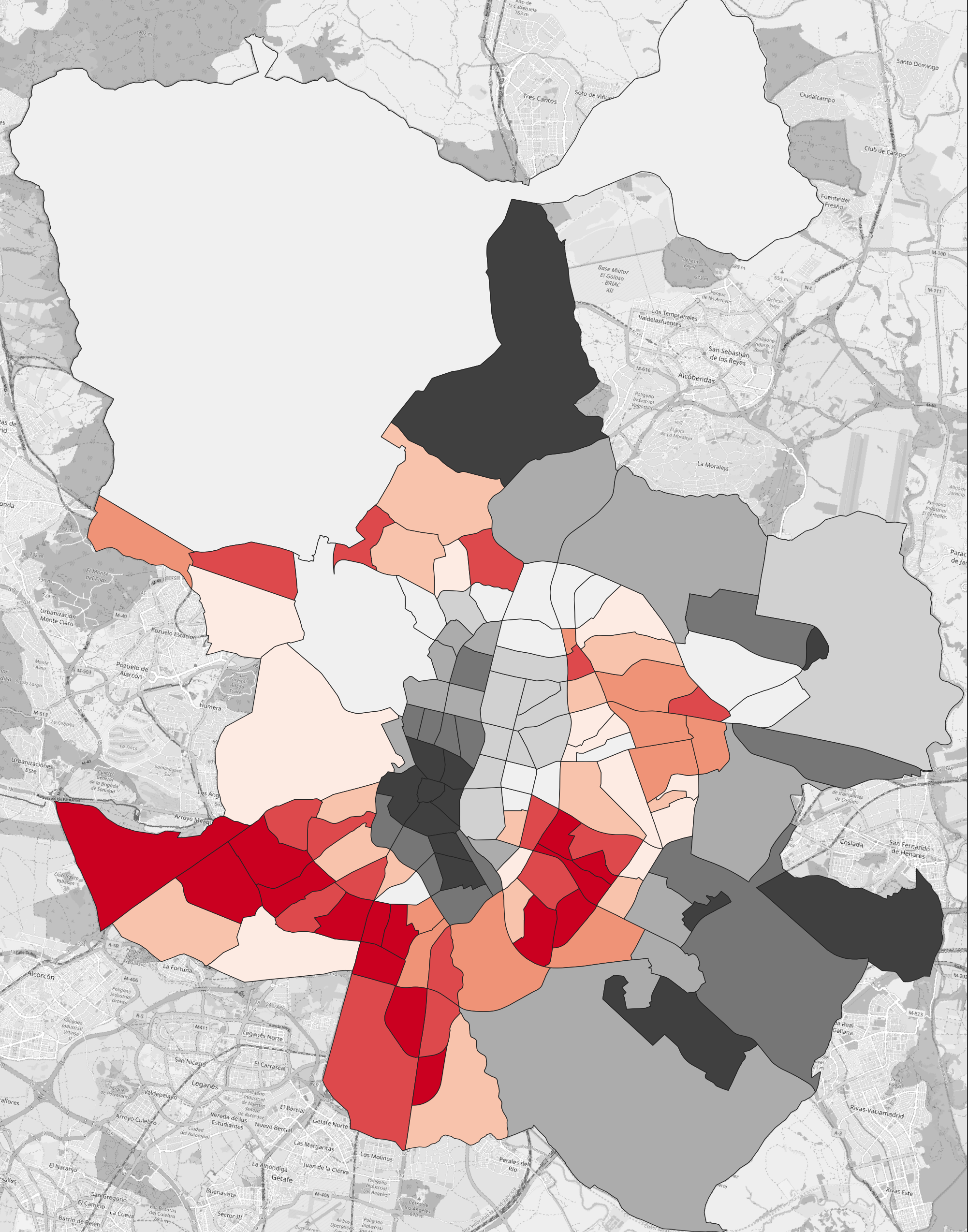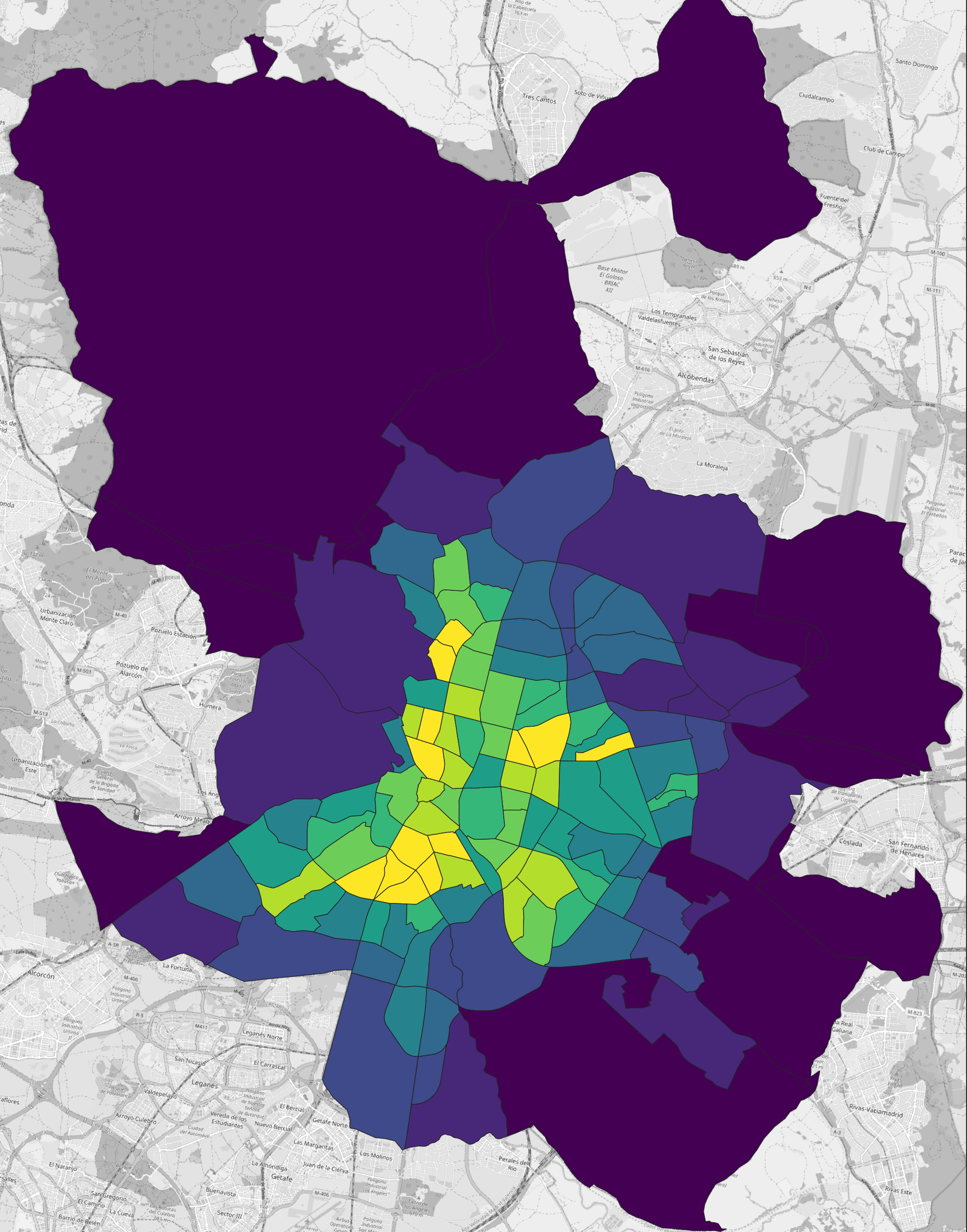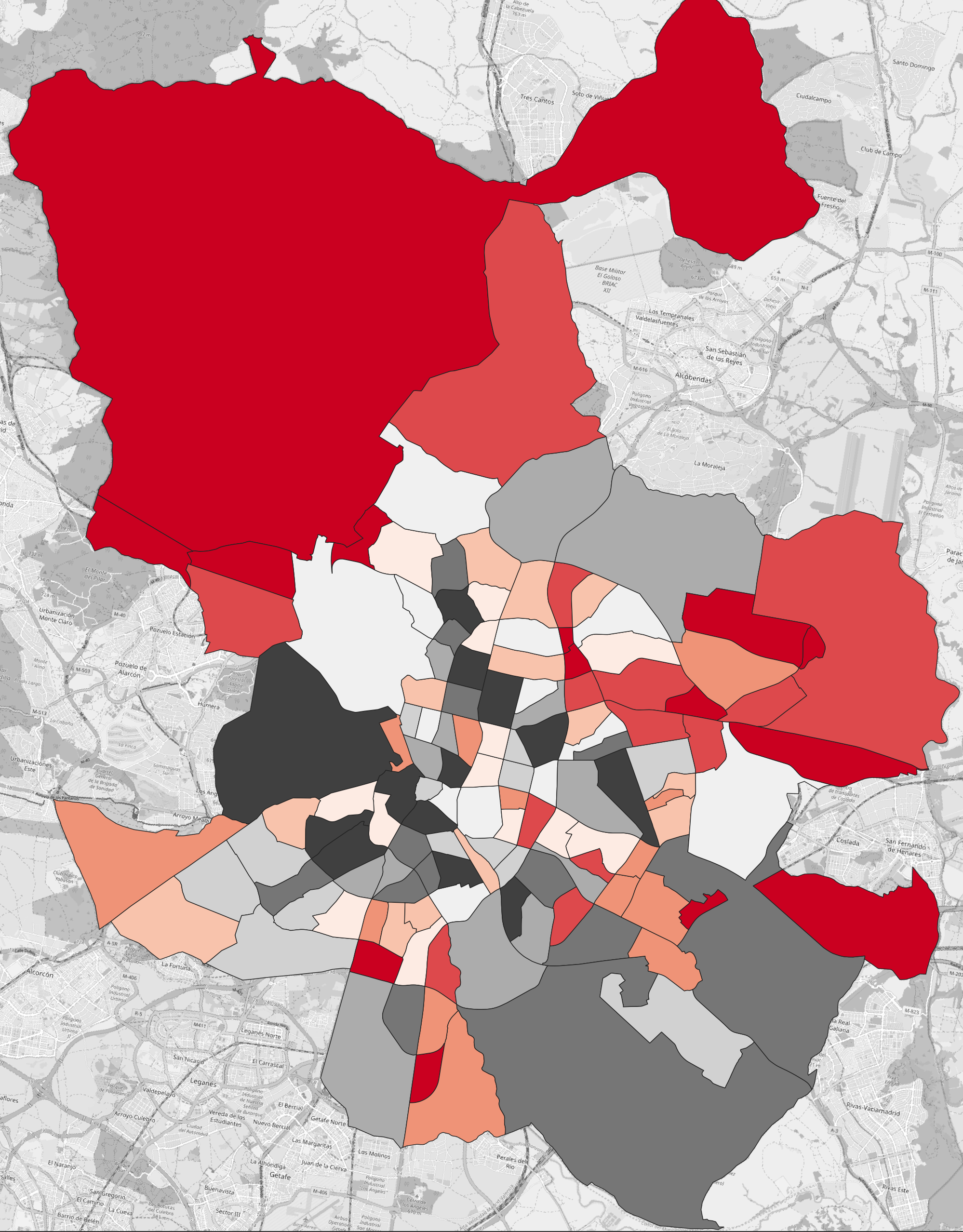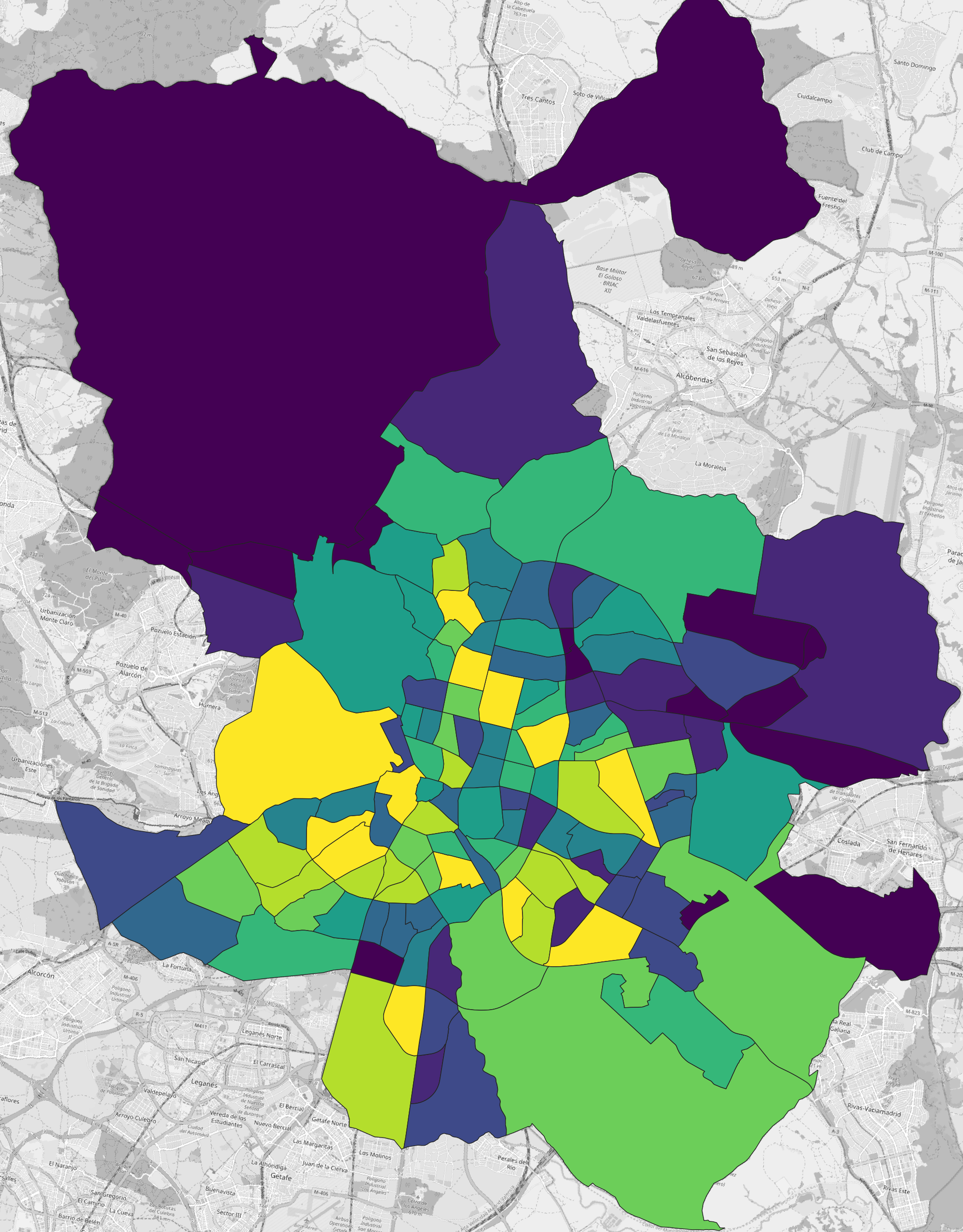 Once we normalise by population count the map becomes much more useful: now we can see relative to the population size of a given neighbourhood whether people are more or less employed. In this case, we can see that the South-West parts of Madrid have lower levels of employment.