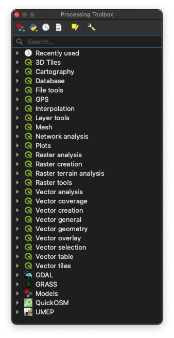 Most of your tools, whether inherent to QGIS or provided by a plugin, will be accessible here. Familiarizing yourself with the terminology of these processes will help you navigate the array of tools and ultimately yield better search results using the top search box.