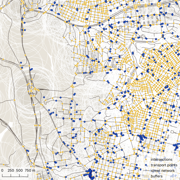 We need to count the intersections and transport stops within 1km2 of each of the intersections. Instead of using 1km x 1km square cells, use a circular buffer with an area equivalent to 1km2 around each intersection. The radius comes from the area formula for a circle: r = sqrt(1,000,000 / pi), which gives roughly 564m. Create buffered Polygon geometries from the intersections.