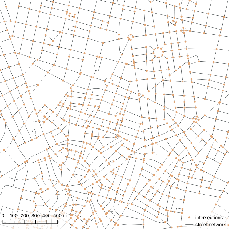 The input streets layer contains LineString geometries, but we need Point geometries for the analysis. QGIS has a tool for extracting line intersections as points.
