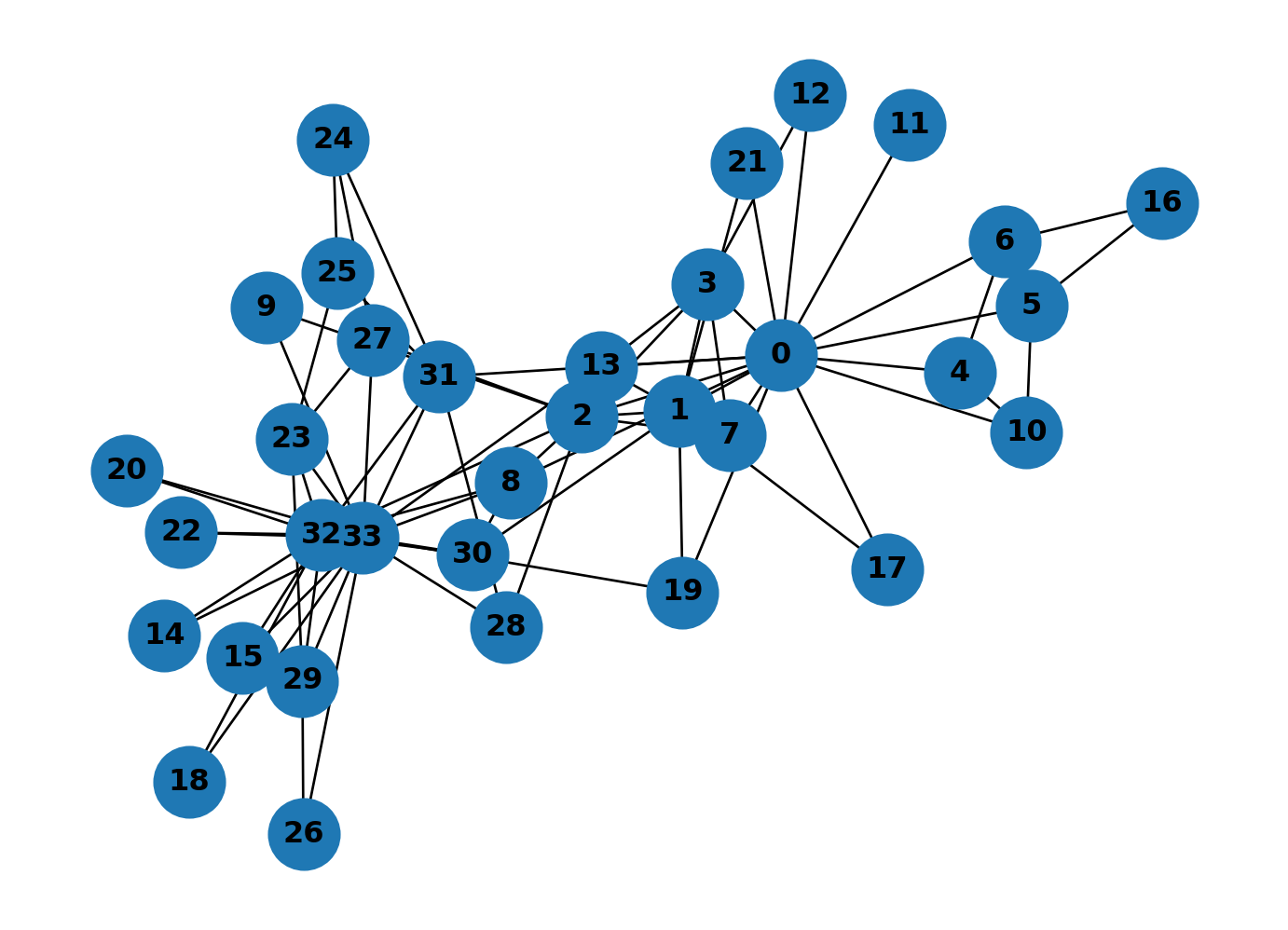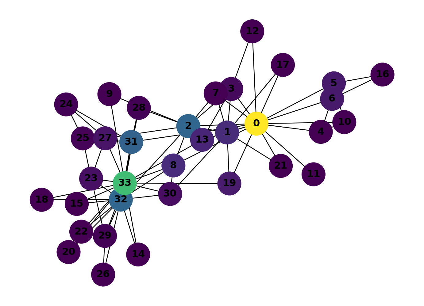 0 wins by a long shot. It sits on far more shortest paths than any other member because it bridges several clusters. Compare this with the closeness plot above: 0 and 33 both scored high on closeness, but betweenness picks out 0 much more strongly. The two measures capture different things: closeness measures how near a node is to everyone else, betweenness measures how much traffic flows through it.