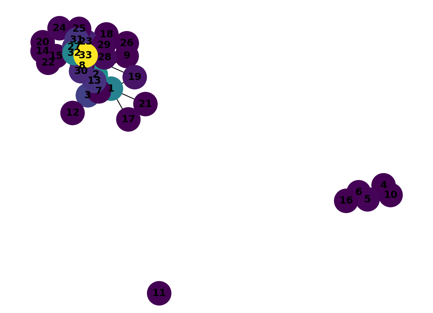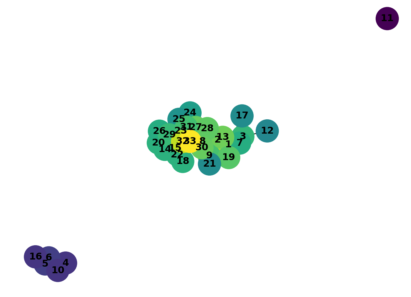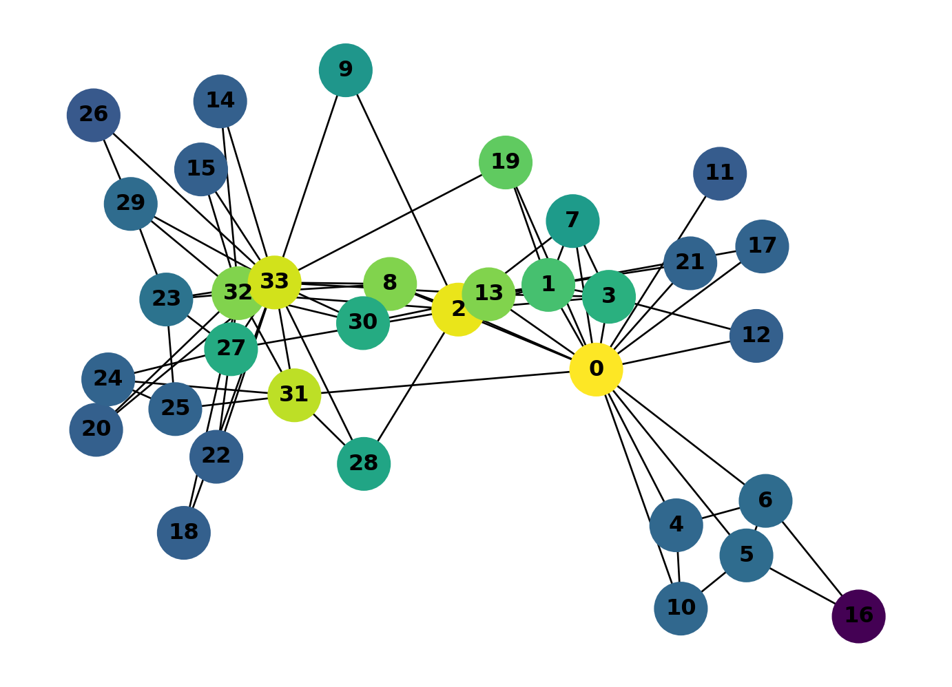 print(closeness_dict){0: 0.5689655172413793, 1: 0.4852941176470588, 2: 0.559322033898305, 3: 0.4647887323943662, 4: 0.3793103448275862, 5: 0.38372093023255816, 6: 0.38372093023255816, 7: 0.44, 8: 0.515625, 9: 0.4342105263157895, 10: 0.3793103448275862, 11: 0.36666666666666664, 12: 0.3707865168539326, 13: 0.515625, 14: 0.3707865168539326, 15: 0.3707865168539326, 16: 0.28448275862068967, 17: 0.375, 18: 0.3707865168539326, 19: 0.5, 20: 0.3707865168539326, 21: 0.375, 22: 0.3707865168539326, 23: 0.39285714285714285, 24: 0.375, 25: 0.375, 26: 0.3626373626373626, 27: 0.4583333333333333, 28: 0.4520547945205479, 29: 0.38372093023255816, 30: 0.4583333333333333, 31: 0.5409836065573771, 32: 0.515625, 33: 0.55}