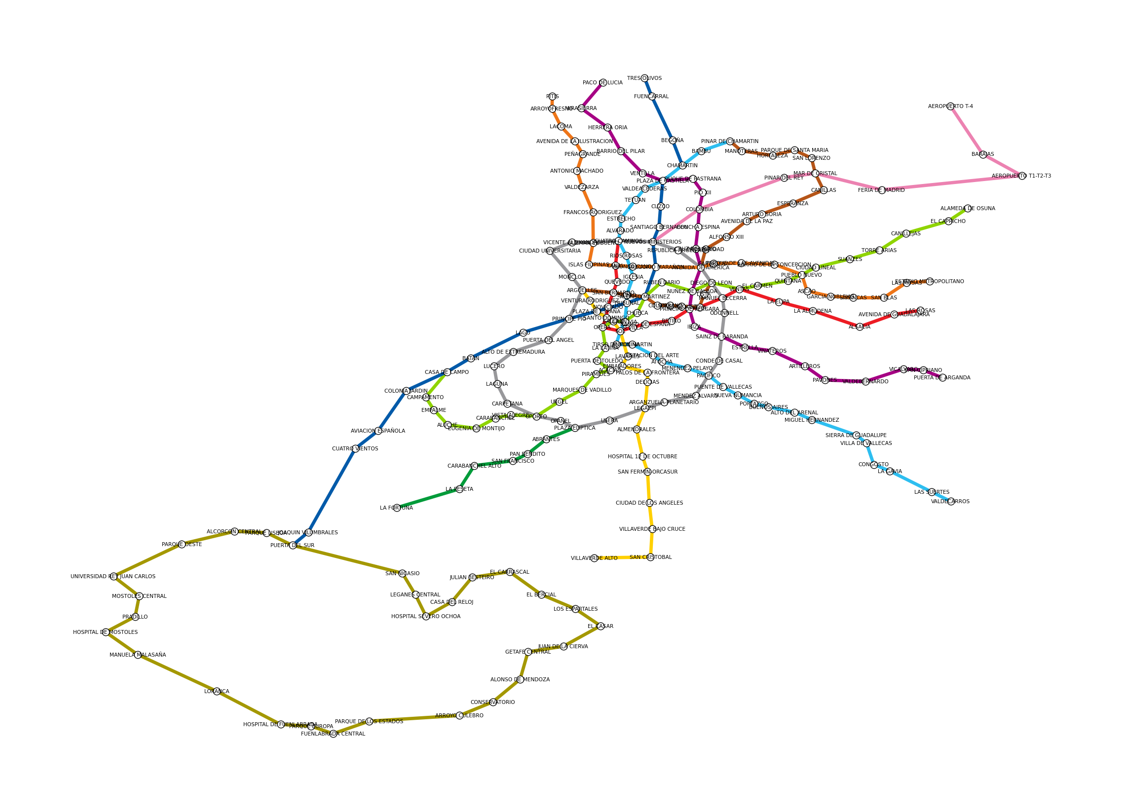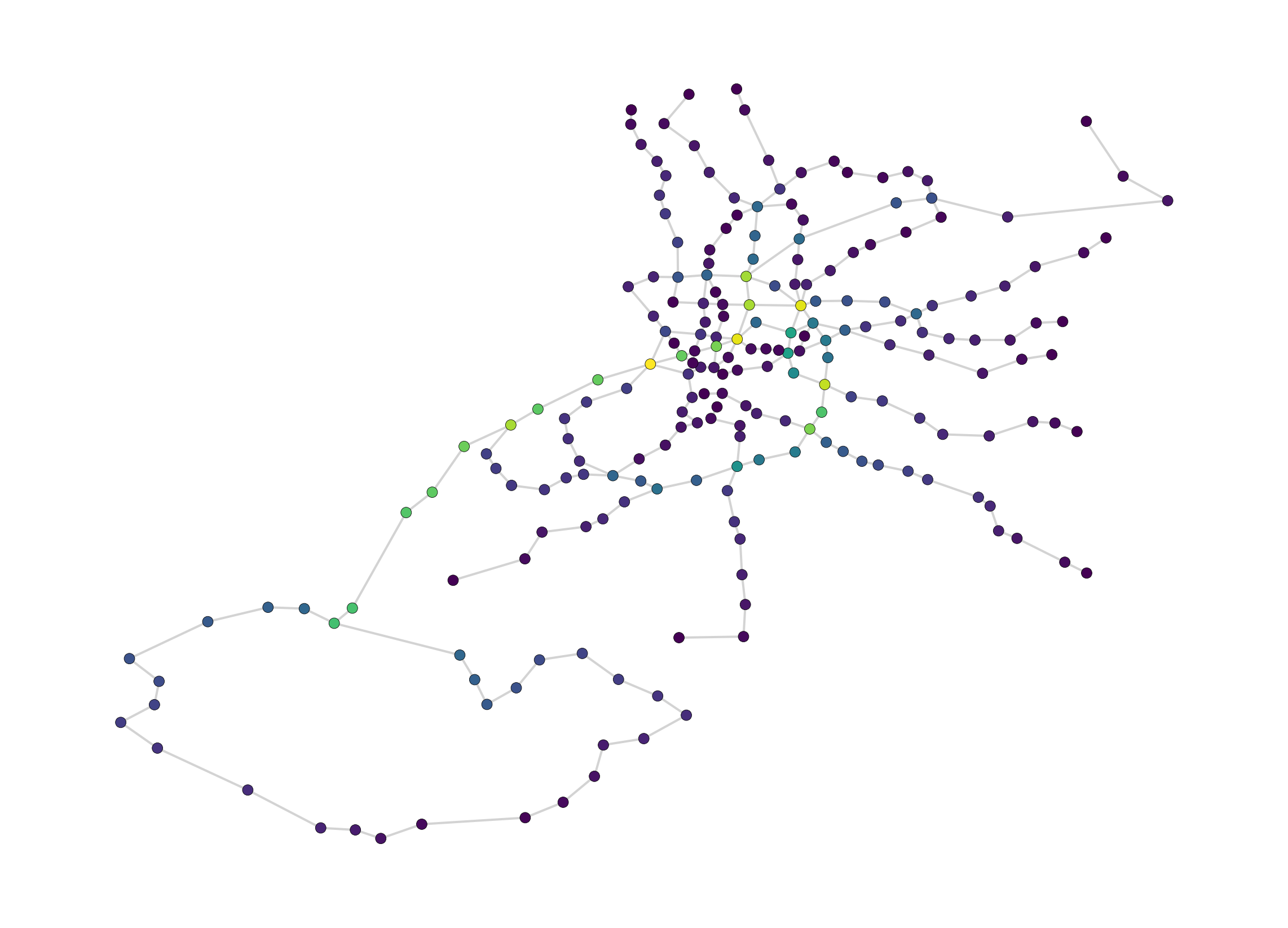 Madrid’s Metro has 220 stations across 13 lines. That makes it a useful real-world network: complex enough to reveal structure, small enough to visualise in full.