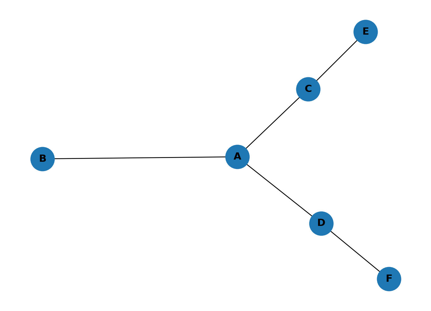 nx.draw(G2, with_labels=True, node_size=800, font_weight="bold")Highest closeness: A (0.7143)
