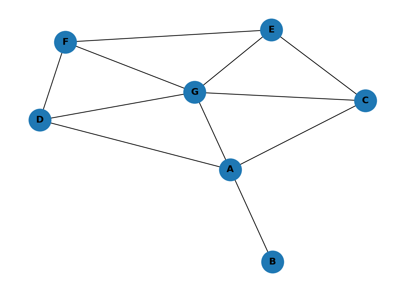 nx.draw(G2, with_labels=True, node_size=800, font_weight="bold")Highest closeness: G (0.8571)