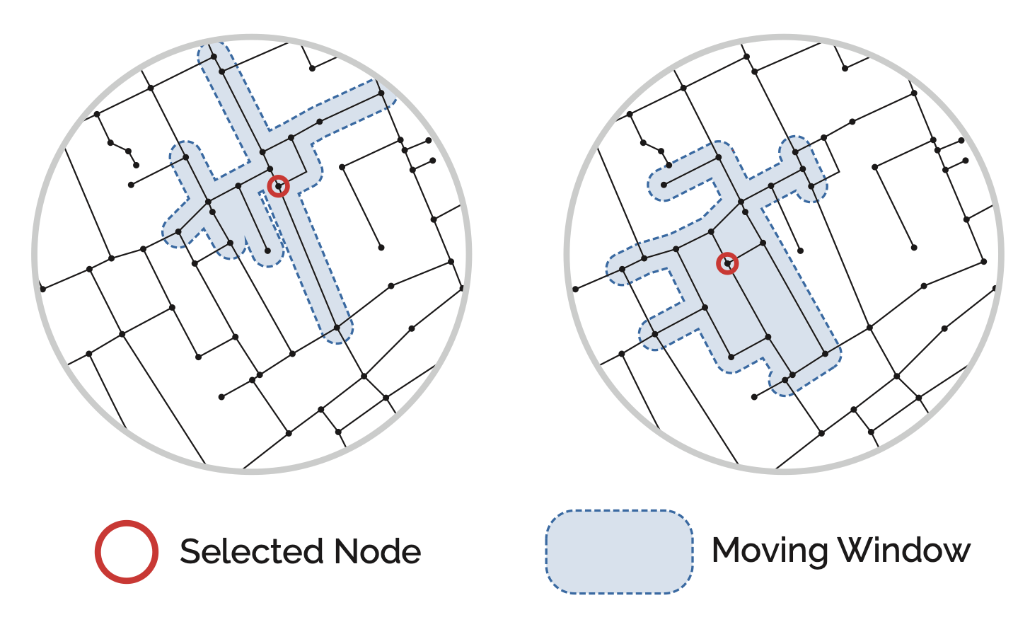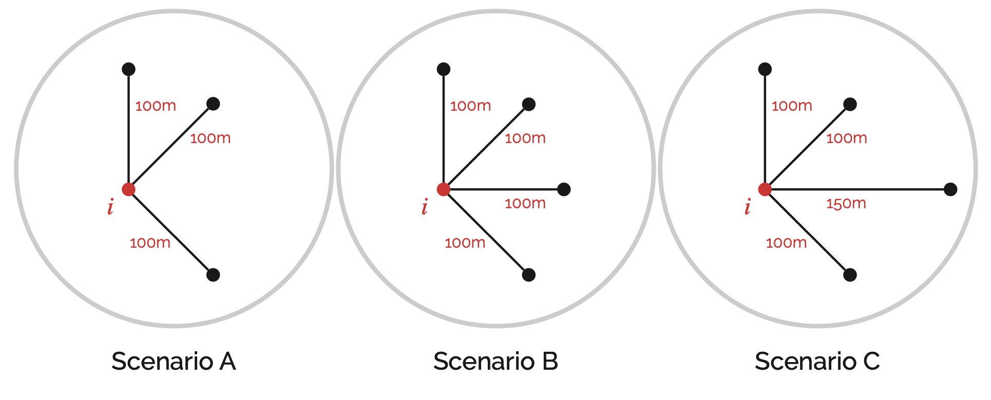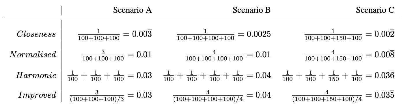 Standard closeness has mathematical quirks when applied to localised analysis. Consider the scenarios in the figure below. Scenario B should have higher closeness than A because it is equally close to more nodes. Scenario C includes a more distant node, so its closeness should be lower than B but still higher than A.