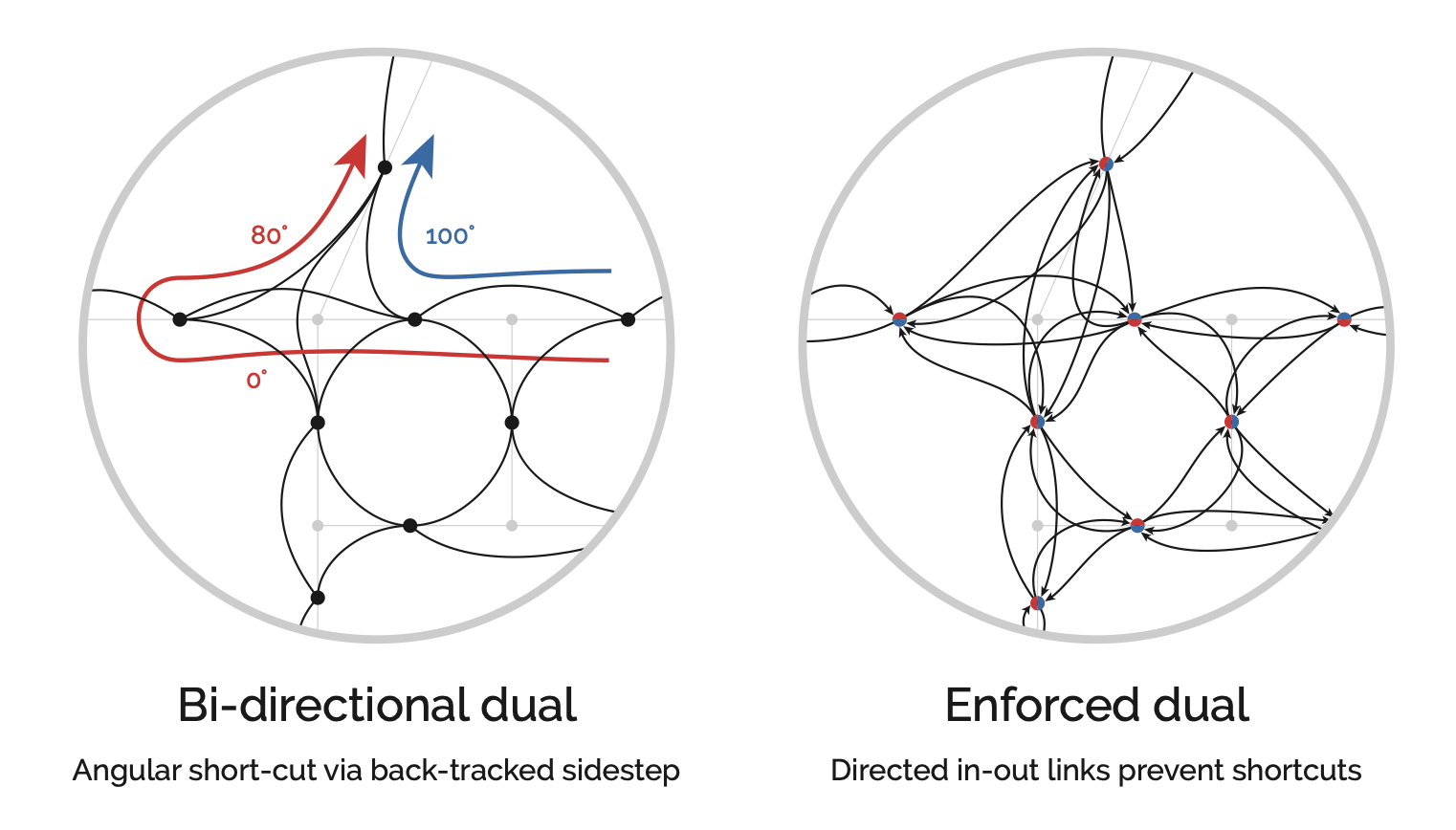Geometric distance introduces a quirk: shortest-path algorithms can sidestep a sharp turn by combining two shallower adjacent angles instead. To prevent this, the algorithm must enforce in-and-out directions at each node so it continues in the direction it arrived (Turner 2007).
