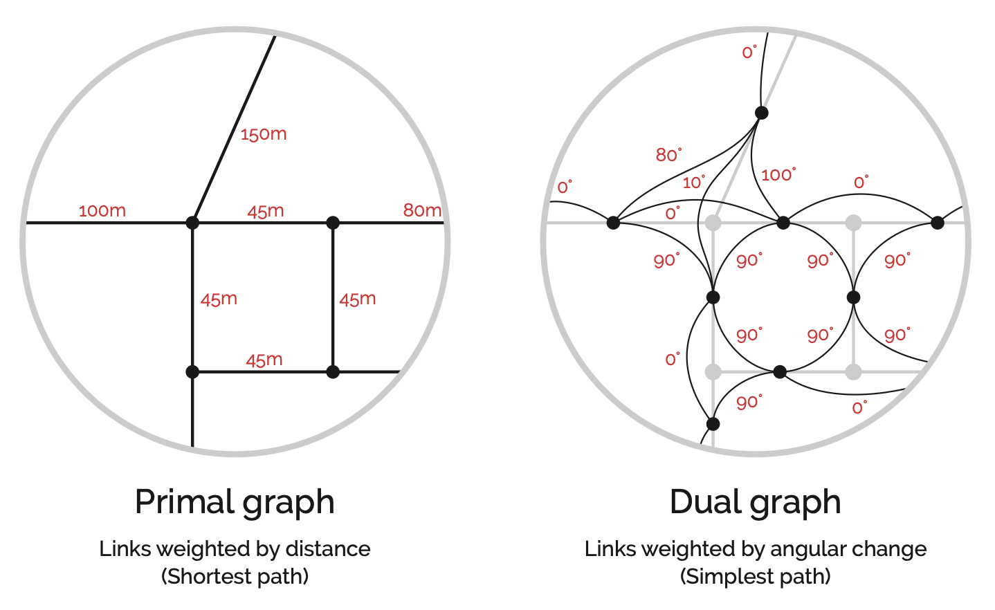 - Geometric distance: angular deviation. A straight route is “shorter” than a winding one, even if the physical distance is greater. Space Syntax favours this metric, based on findings that geometric simplicity influences land use patterns and pedestrian movement (Penn et al. 1998; Hillier et al. 2007; Serra and Hillier 2019).