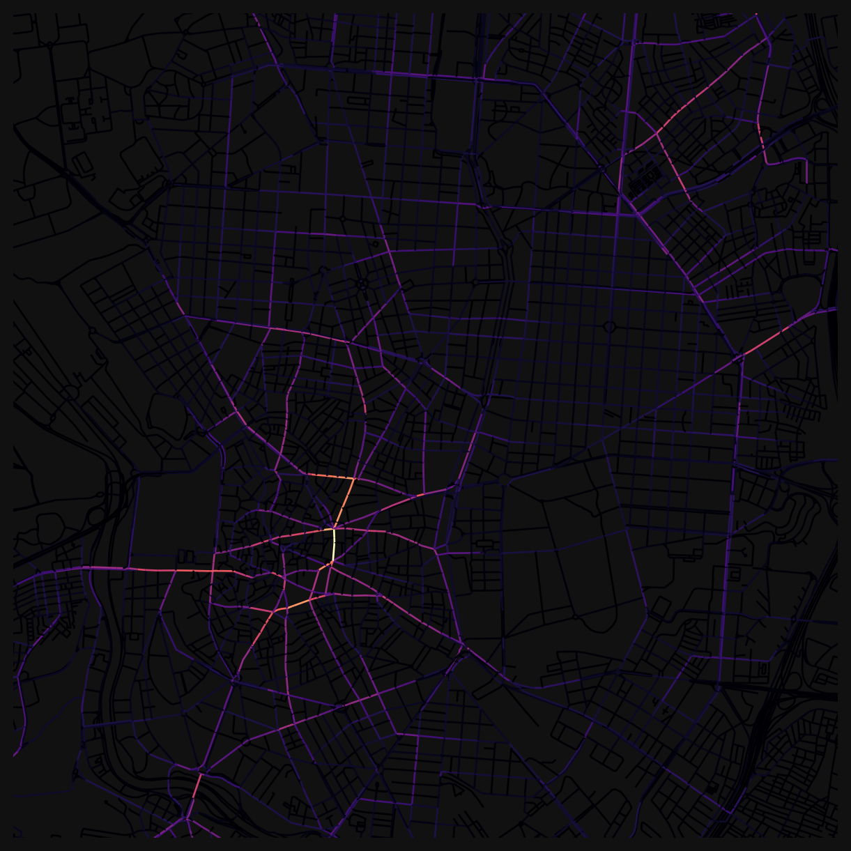 Different distance thresholds reveal different structures. The images at the top of this page show the contrast: at 800m, betweenness picks out local through-routes within neighbourhoods, while at 10km, the city-wide arterials dominate.