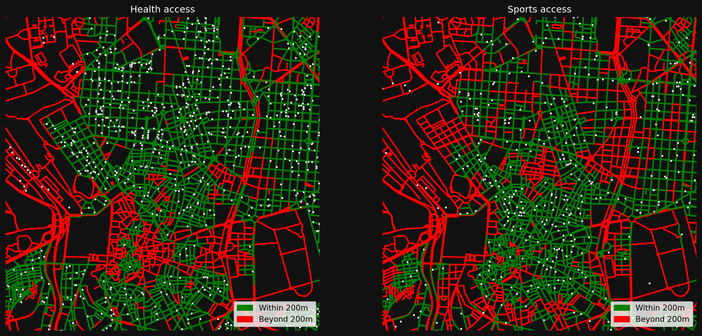 access_legend = [Patch(color="green", label="Within 200m"), Patch(color="red", label="Beyond 200m")]