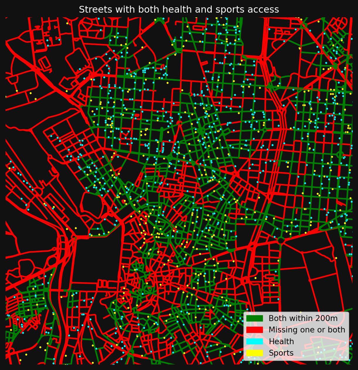 - Coverage: Pick two amenity types (e.g. health and sports_rec). Where are streets that have access to both within 200m? Map the result.