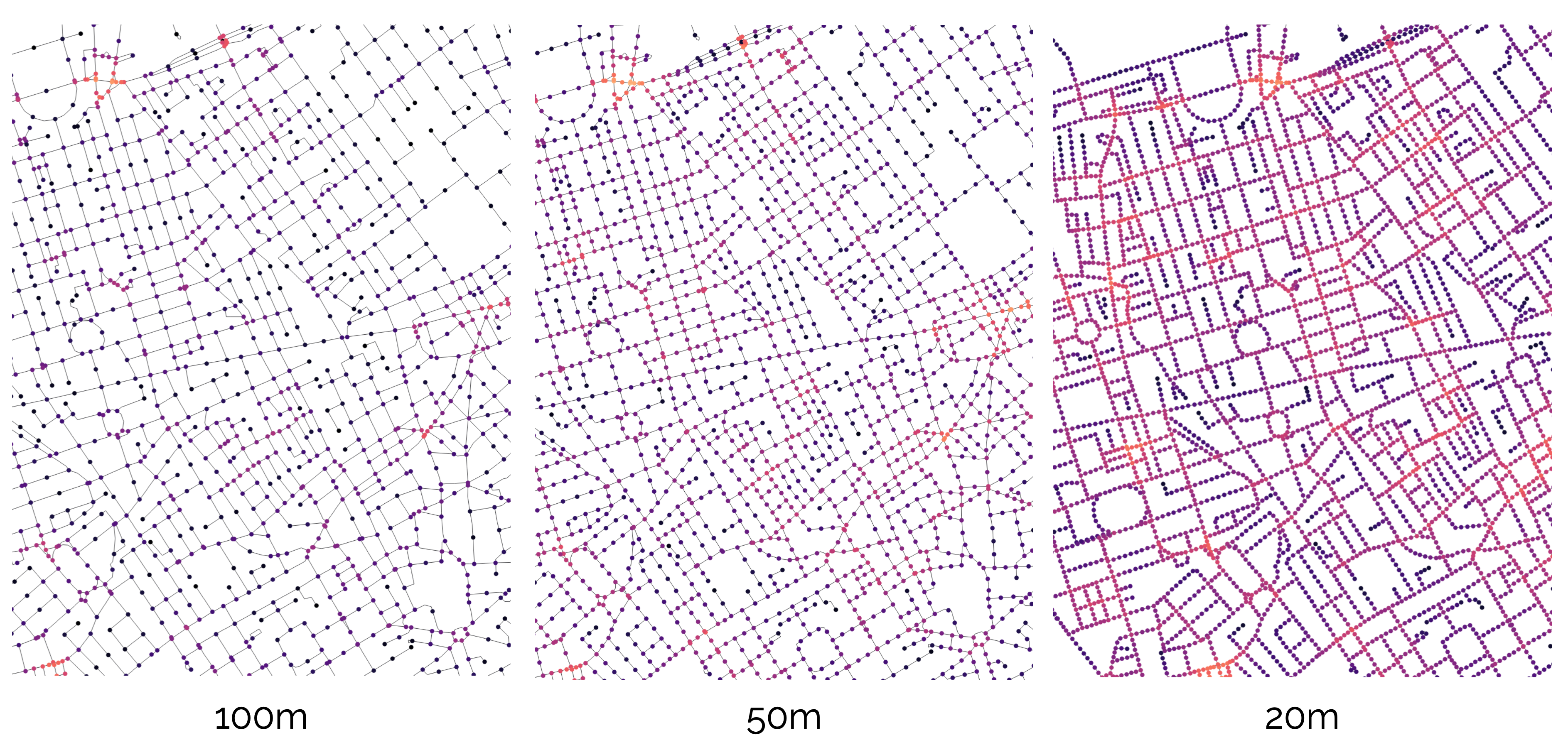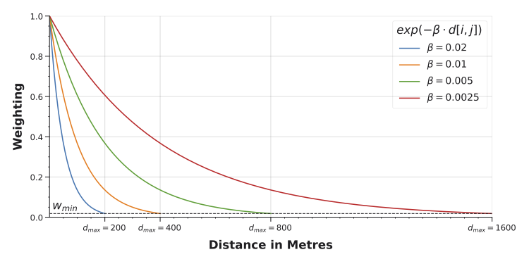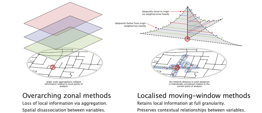 These approaches can work surprisingly well, but it is sometimes preferable to have greater precision, especially when working at a granular scale of analysis: a landuse can suddenly seem much farther away when it is on the opposite side of a large block, or when running into a barrier such as a river, motorway, or railway line. In these cases, we can be more precise about how landuses are assigned to streets, how distances are measured over the network, and how contributions are weighted by distance. While more complex, the underlying idea remains the same: we’re quantifying spatial access to “something”.