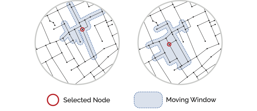 In the Network Analysis lesson the concept of a “moving window” form of spatial analysis was introduced. This approach works by figuring out which other street network nodes are within a specified distance from a source node (the current point of analysis) given distances measured over the street network. This “inverts” how we look at space: instead of looking from the outside-in we are now quantifying from the inside-out, i.e. we are adopting a pedestrian’s perspective of locations and distances.