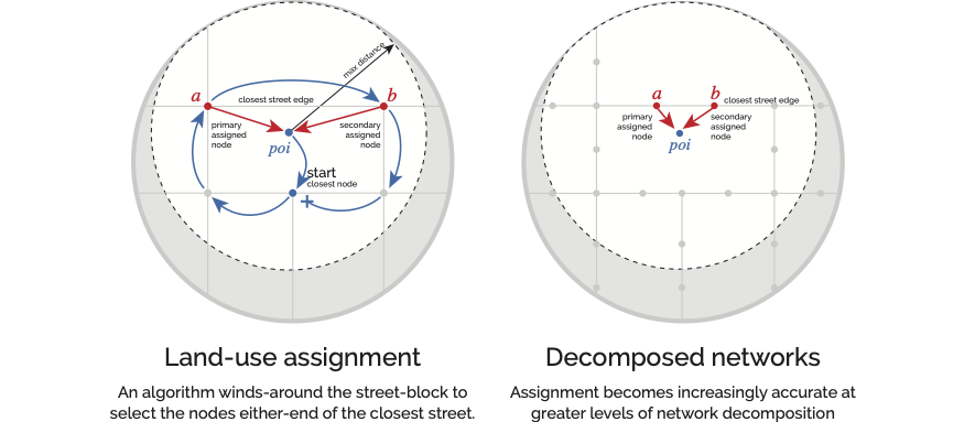 Once computed, we know which other streets can be reached within a certain distance from any given point of analysis. However, we also need to know which street a particular landuse is associated with. For point data, this is achieved with a winding algorithm: from each landuse location, an algorithm looks for the closest street network node and then “circles the block” to identify the closest adjacent street edge. The landuse is then assigned to the nodes on either side of this street so that the algorithms which measure distances can subsequently use either direction of approach when determining whether a landuse can be reached from the current point of analysis.